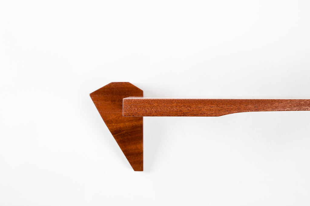 The Odyssey wood shelf provides the perfect display for your most cherished items. Shown here in African Sapele wood with faceted brackets. Also available in a variety of wood choices with smooth, rounded brackets, and custom sizes.