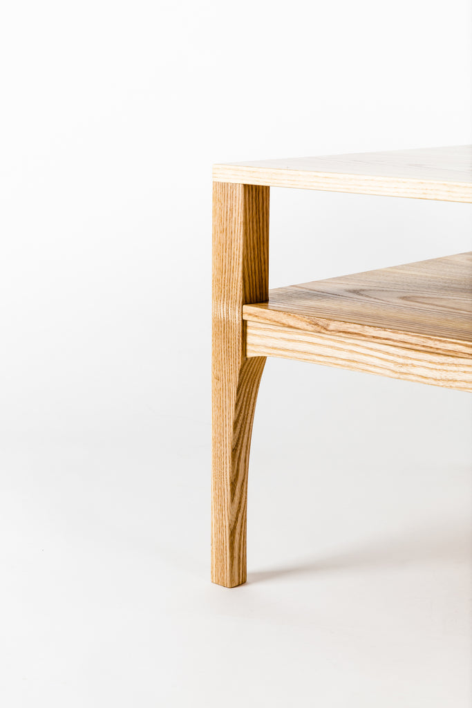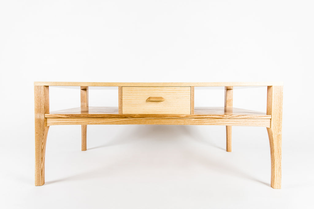 The Rodina custom veneered coffee table shown here in Ash wood is much more than meets the eye. The middle drawer is constructed with hand cut dovetails and opens from both ends. Rare earth magnets embedded in the table and drawer ensure the drawer always finds its perfect resting place in the middle.