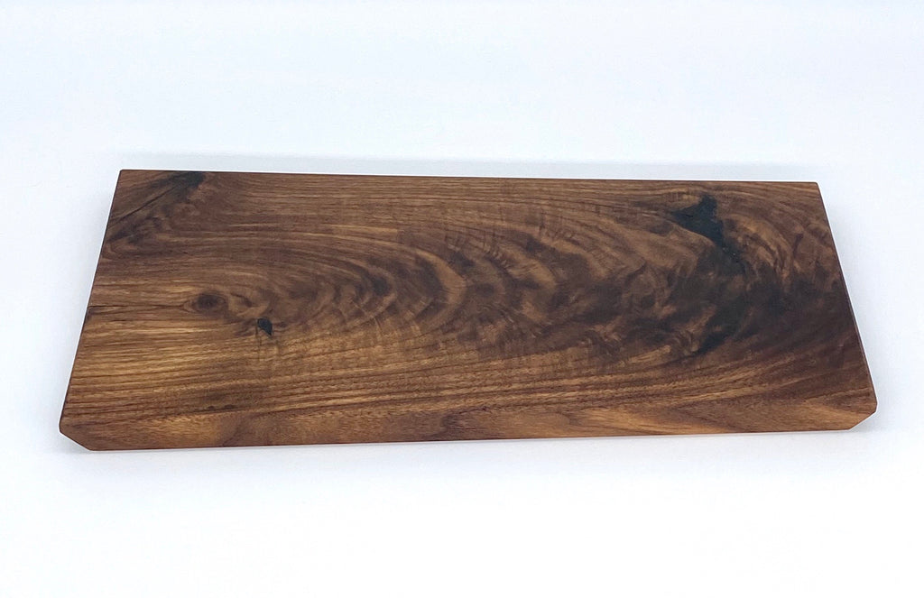 Walnut wood serving board with discreet finger holds and contemporary design. Subtle angles. Beautiful Walnut wood. Chamfered ends for a comfortable grip. A serving board you’ll be proud to bring out for guests or when you just want to have snacks for dinner in style.