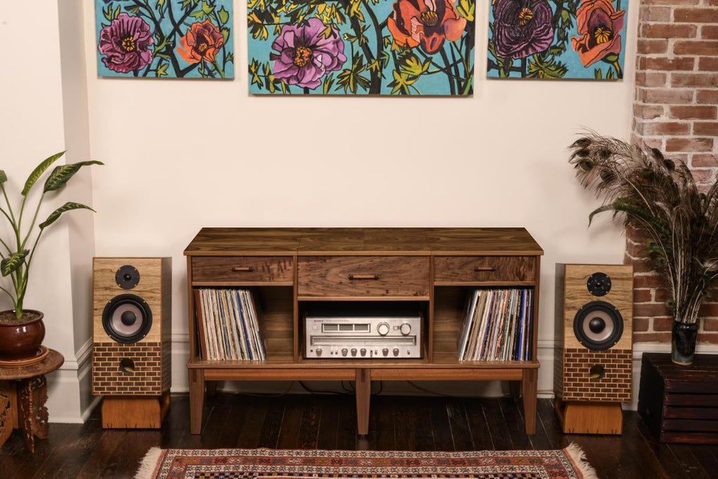 An elegant statement piece taylor made for the audiophile. This stereo cabinet features shop sawn Walnut veneer beautifully arranged to form a waveform pattern that waterfalls across the top and down each side. The cabinet itself is built with mortise and tenon joinery, the drawers have pinned lock joints in each corner, and the base is assembled with castle joints in each leg which are highlighted by the tenons showing through on two sides. The cabinet features two drawers, a flip up lid, with a soft close arm, which reveals the space for the turntable, a space below to house the receiver, and LP storage on either side.