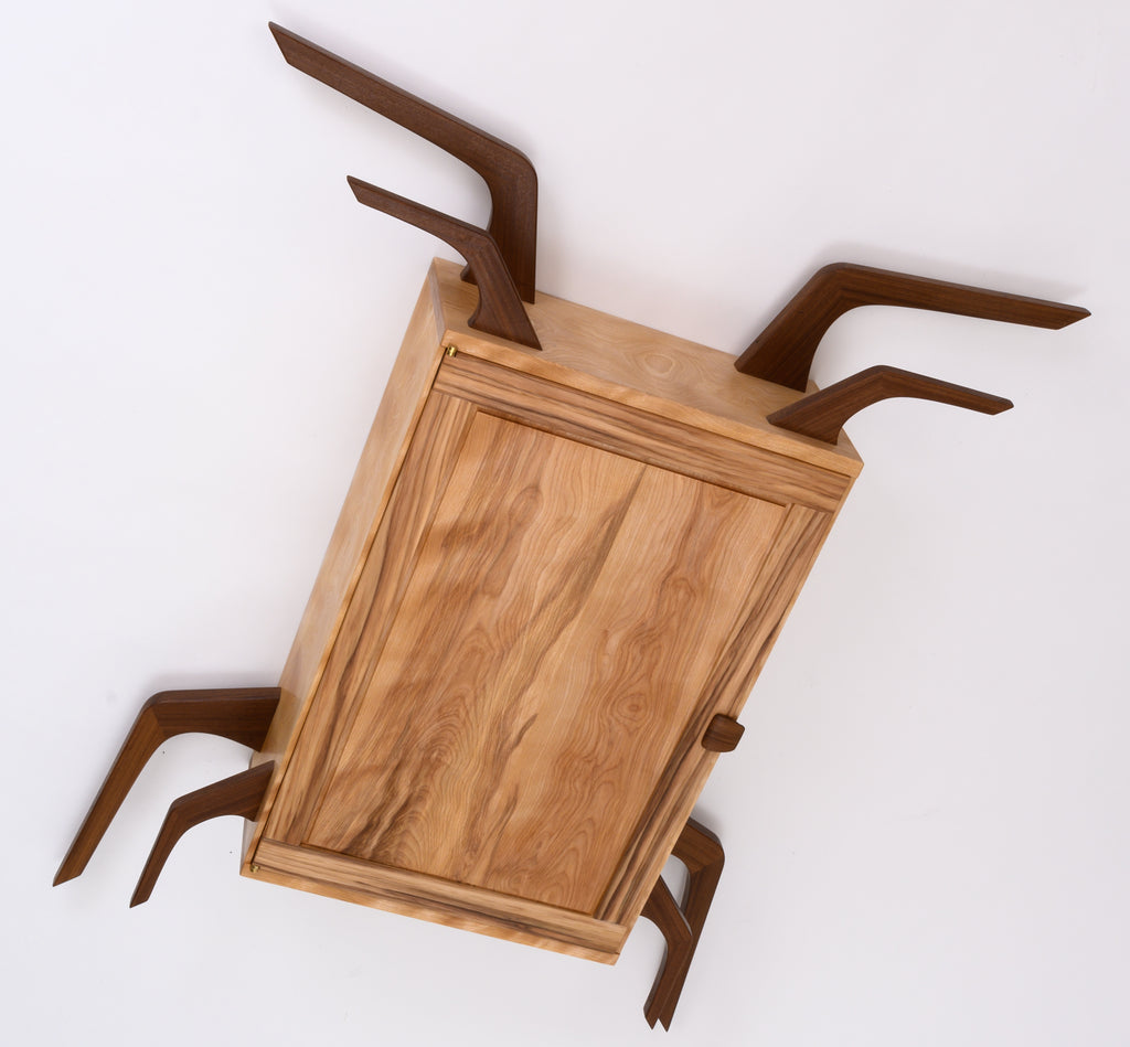 This unique wood wall cabinet design was inspired by the elements. Its fins represent Air, the wavy figure inside the cabinet represents Water, the wood construction represents Earth, and the pattern on the door represents Fire.